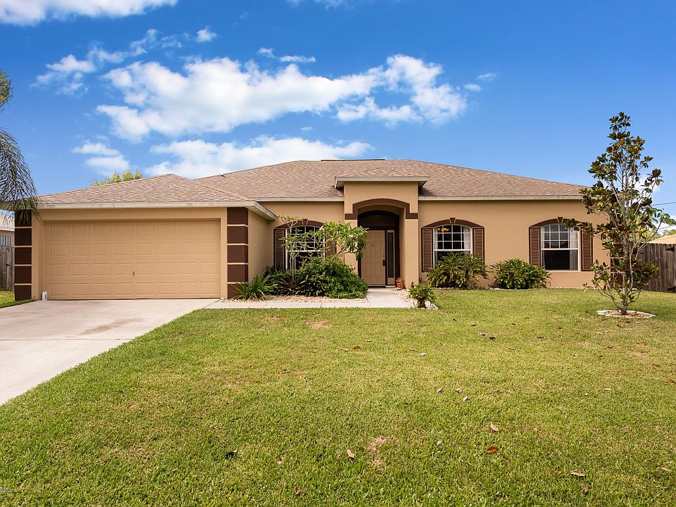 Captivating City Water & Sewer NW Palm Bay Home Ready for New Owners! **Split floor plan home with 10 ft ceilings throughout and an abundance of natural light. **Multi-functional living spaces including a den/office with a built in desk. **Island layout kitchen offers stainless steel/black appliances, plenty of counter space and a large breakfast bar. **Spacious master suite features his/hers closets, double sinks, separate shower, and garden tub. **Energy efficient AirTap Water Heater. NASA Technology at work in the home with Ionics Water Softening System. **Stand tall in the ample attic storage. **Exterior paint February 2020. **Screen porch & fenced back yard. **All of this and a BRAND NEW HVAC! **Minutes to everything you need for day to day living.