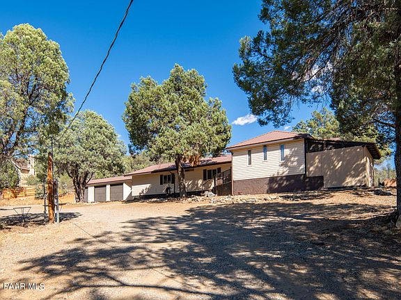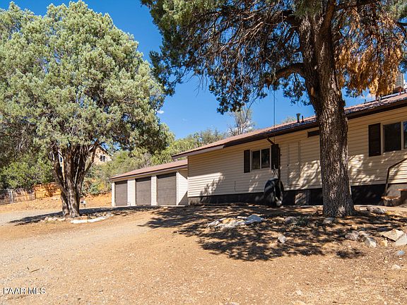 Discover your personal 1.22 Acre oasis nestled against the sprawling expanse of Prescott National Forest on two sides! 2 wells on the property, 1 is currently dry and the other is full of roots. 2 holding tanks, one 2500gal with non potable water, perfect for irrigation, second has clear water and should be used for hauled water containment. The home is an original manufactured home with multiple additions with nearly 2300 square foot providing 3 bedrooms, two baths, great room with word burning fireplace, generous dining area & 3-car garage. This home is being sold in its current condition and is priced accordingly. Make it your sanctuary, where the trails outside your door, lead into the Prescott National Forest