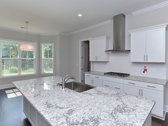 Huge front porch! This stunning McKenna II plan with 10' ceilings on main level, has five bedrooms and four-and-one-half bath home that features both formals with beautiful trim and five-inch plank hardwood flooring throughout the downstairs living areas and upstairs hallway. The spacious gourmet kitchen comes with quartz countertops, a built in five burner gas cooktop and wall oven and microwave and has a breakfast area with great views of the back yard from a large bay window. The master bedroom suite is upstairs featuring a luxurious split vanity bathroom, gigantic walk-in-closet, and bay window sitting area! The large upstairs bonus room makes for a perfect media room, play room, or man cave. There is a guest suite with a full bath downstairs and the family room with sunroom opens to a huge oversized patio that is perfect for outdoor relaxation.