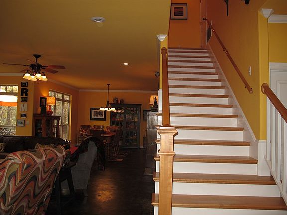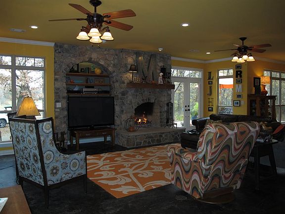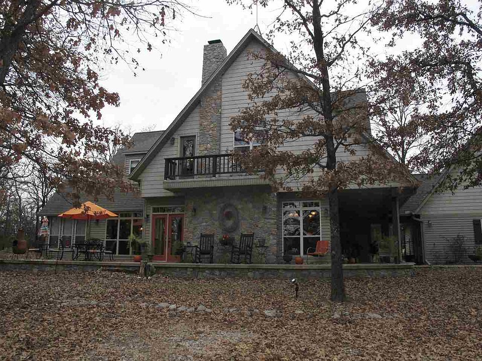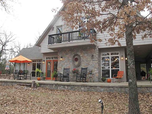Lg. wrap around porch overlooking pond. Great Rm., Dining & Kitchen w/CC stained floors, Rock WBFP & many windows. Vaulted Ceiling & crown molding. Kitchen w/darling "built in" booth table, kitchen island, 5 Burner stove & desk area. Walk-in pantry serves as Safe Room. Sun Room has vaulted box car ceiling. Downstairs bedroom could be office. Upstairs bedrooms w/wood floors. Central Vacuum. Master Bath Shower & Claw Ft. Tub. Pond w/Deck. 50x30 shop. Hot tub. 480 sq. ft. cabin. 1 mile of Caddo Creek