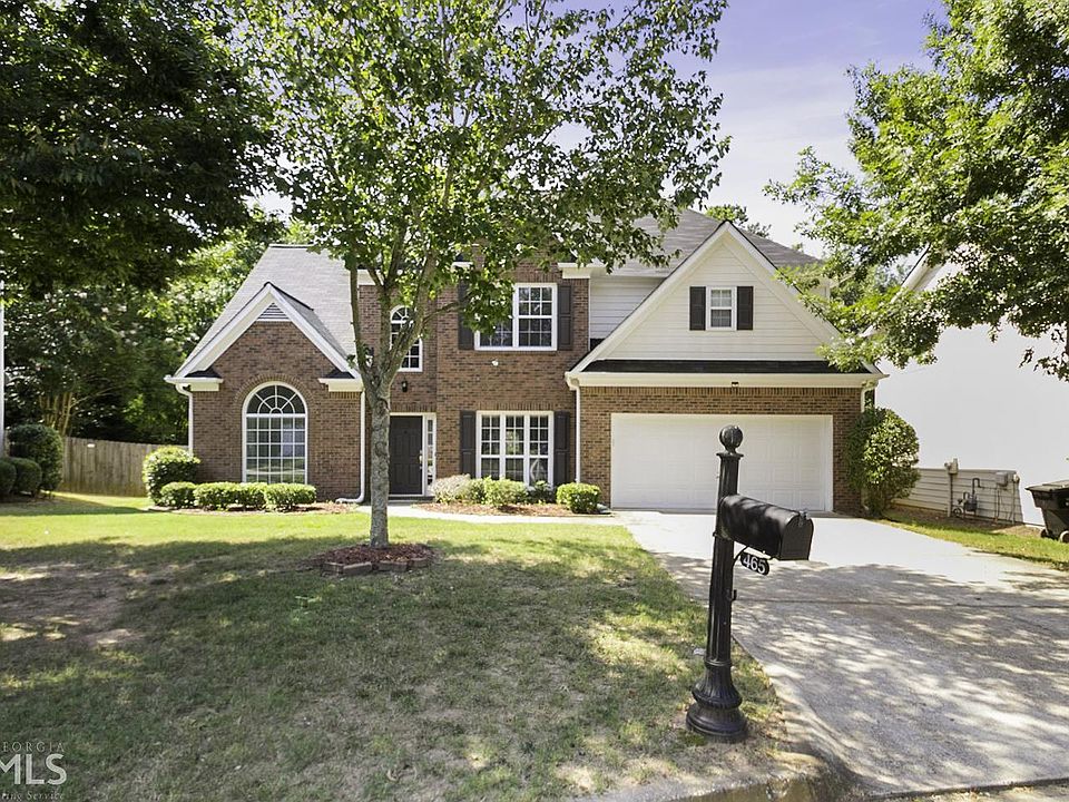 This Mableton cul-de-sac two-story home offers a den, vaulted ceilings, fireplace, patio, and two-car garage.