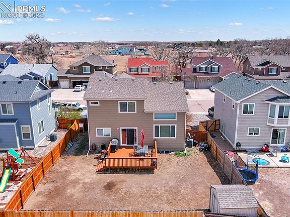 Wonderful 4 bedroom home on private cul-de-sac with adorable front porch. Upon entering you will notice the spacious living room with high ceilings and many widows for allowing in plenty of natural light. The main level has a spacious living room, dining area, large kitchen, and half bath. In the kitchen enjoy the matching stainless steel appliances, pantry, and dining area with sliding doors to the sizeable deck, (16x16). Main floor is complete with attractive and durable solid surface luxury laminate plank flooring. Upstairs you'll find the primary suite, 2 bedrooms, an additional bathroom, and a nook/loft area for a work space or reading area. The primary bedroom has a private bathroom, closet, and mountain views. All new carpet upstairs! In the basement, there is an additional family room, bedroom, and 3/4 bathroom; a perfect space for privacy when you have guests! No HOA. Minutes away from I25, Fort Carson, Powers Corridor, and shopping. Heritage Subdivision includes parks and attaches to walking trails.