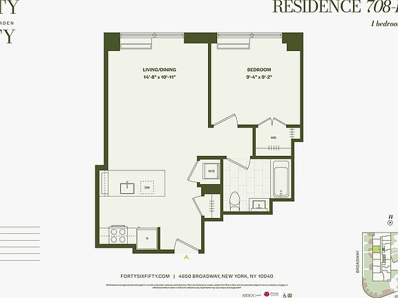 Go beyond the ordinary, at a lifestyle oasis that features stunning interiors and extraordinary amenities, all with panoramic park and river views. Enjoy meticulously-crafted residences with generous interiors and state-of-the-art finishes, as part of an experience in truly holistic living that goes beyond and above anything that has come before. Amenity Features Include: - Double Height Wood-Paneled Lobby, with Stone Fireplace Feature Wall and Green Wall - Package Room - Amenity Lounge with Co-Working and Individual - Phone Booths - Private Lounge with Demonstration Kitchen - Children's Playroom - Pet Spa - Resident Storage Available - Bicycle Storage Available - Onsite Garage Parking Available - Game Lounge with Billiards, Pinball, Shuffleboard, Foosball, Video Games, Projector Screen and Wetbar - Smart Lending Library - Fitness Center offering Precor Equipment and Peloton Bikes - Yoga Room - Basketball Court - Landscaped Terrace with Outdoor Lounge, Pool Table, Chaise Lounges and Barbecue Grills Residence Features: - Soaring Ceilings Over 9ft - Luxury White Oak Vinyl Wide Plank Flooring - Oversized VIEW Smart Windows - Complimentary Blackout Roller Shades in Bedrooms - In-Home Bosch Washer/Dryers - Smart Keyless Home Entry - Oak Veneer Custom Designer Vanity with Stainless Steel Pulls - White Solid Surface Countertops - Contessa Dama Porcelain Tiled Floors and Wet Walls - Grey Waterfall Mosaic Tiled Porcelain Feature Wall - Calacatta Porcelain Tile Baseboards - Kohler Polished Chrome Fixtures - Mirrored Medicine Cabinets with Integrated Lighting - GE Stainless Steel Appliance Package with Induction Range - Designer White High Gloss Cabinetry with Stainless Steel Pulls and Undercabinet Lighting - Calacatta Capri Quartz Countertop and Backsplash - Kohler Pull-Out Faucet in Vibrant Stainless For convenient commuting, Forty Six Fifty is located moments from multiple bus stops, the Dyckman Street Subway Station with express A Train service, the 1 Train at 107th Street Station, The West Side Highway, as well as public and private parking. Prices and features are subject to change. All apartments are exempt from rent control. All images are a combination of photography and artist renderings.