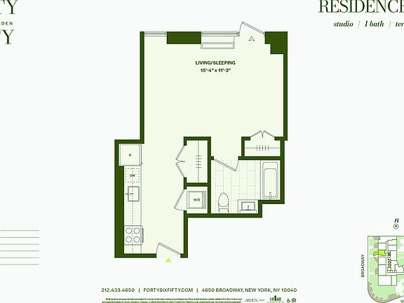 A world of wonder awaits at Forty Six Fifty; a stunning collection of brand new studio, one, and two bedroom homes in Inwood, overlooking Fort Tryon Park and The Cloisters at the northern tip of Manhattan. Striking architecture and sustainable design by Arden Group deliver a lifestyle that exceeds expectations, marrying the quiet elegance of Inwood with seamless access to the rest of the city. Biophilic features like a living green lobby and landscaped rooftop offer a home in-tune with nature. Lush terraces and manicured gardens allow for a sense of escape from the grind, while some of the city's most beloved park spaces provide the ideal backyard. Go beyond the ordinary, at a lifestyle oasis that features stunning interiors and extraordinary amenities, all with panoramic park and river views. Enjoy meticulously-crafted residences with generous interiors and state-of-the-art finishes, as part of an experience in truly holistic living that goes beyond and above anything that has come before. Amenity Features Include: Double Height Wood-Paneled Lobby, with Stone Fireplace Feature Wall and Green Wall Package Room Amenity Lounge with Co-Working and Individual Phone Booths Private Lounge with Demonstration Kitchen Children's Playroom Pet Spa Resident Storage Available Bicycle Storage Available Onsite Garage Parking Available Game Lounge with Billiards, Pinball, Shuffleboard, Foosball, Video Games, Projector Screen and Wetbar Smart Lending Library Fitness Center offering Precor Equipment and Peloton Bikes Yoga Room Basketball Court Landscaped Terrace with Outdoor Lounge, Pool Table, Chaise Lounges and Barbecue Grills Residence Features: Soaring Ceilings Over 9 Luxury White Oak Vinyl Wide Plank Flooring Oversized VIEW Smart Windows Complimentary Blackout Roller Shades in Bedrooms In-Home Bosch Washer/Dryers Smart Keyless Home Entry Oak Veneer Custom Designer Vanity with Stainless Steel Pulls White Solid Surface Countertops Contessa Dama Porcelain Tiled Floors and Wet Walls Grey Waterfall Mosaic Tiled Porcelain Feature Wall Calacatta Porcelain Tile Baseboards Kohler Polished Chrome Fixtures Mirrored Medicine Cabinets with Integrated Lighting GE Stainless Steel Appliance Package with Induction Range Designer White High Gloss Cabinetry with Stainless Steel Pulls and Undercabinet Lighting Calacatta Capri Quartz Countertop and Backsplash Kohler Pull-Out Faucet in Vibrant Stainless For convenient commuting, Forty Six Fifty is located moments from multiple bus stops, the Dyckman Street Subway Station with express A Train service, the 1 Train at 107th Street Station, The West Side Highway, as well as public and private parking. Prices and features are subject to change. All apartments are exempt from rent control. All images are a combination of photography and artist renderings and are provided for illustrative purposes only.