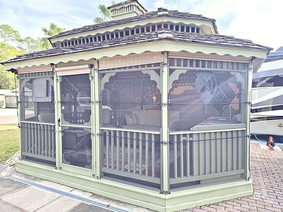 Experience effortless luxury at Lot 12 in Terry Cove, a premier gated motor coach community designed for comfort, convenience, and resort-style living. Ideally located just two sites from the entry gate, this pull-thru lot sits on a level grade, allowing for easy, stress-free arrival and departure. The 10’ x 10’ coach house is thoughtfully equipped far beyond simple storage, featuring a toilet, stacked washer and dryer, and a laundry sink. Double entry doors provide convenient access, while additional cabinetry and a loft above the entry offer smart, efficient storage solutions. Outdoor living truly shines beneath the 12’ x 18’ gazebo, a beautifully appointed space perfect for relaxing or entertaining. Enhanced drainage—including a drive drain and surrounding French drain—keeps the area dry even during heavy rains. Roll-up Coolaroo shades add weather protection, UV shielding, and privacy at your discretion. Inside the gazebo, enjoy upgraded furnishings including a sofa, two swivel rockers, ottomans, and a stylish cocktail table anchored by a vibrant area rug. A smart TV is discreetly housed within cabinetry that provides ample storage, alongside an under-counter refrigerator, dishwasher, and bar sink—creating a seamless indoor-outdoor entertaining experience. Comfort is ensured with a centrally located lighted ceiling fan and rafter-mounted oscillating fans, while LED strip lighting casts a warm glow across the ceiling in the evening, enhanced by tasteful metal art accents throughout the property. Terry Cove offers resort-style amenities, including two pools, and there’s dedicated space for your golf cart—perfect for cruising to the beach just a few miles away. This property is easy to show and ready to impress. Buyer to verify all information during due diligence. Buyer to verify all information during due diligence.