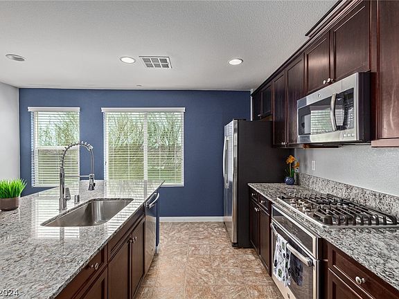 Welcome to a luxurious Tri-Level townhome nestled in the exclusive gated community of North Las Vegas. This hidden gem features 3 bedrooms, 3.5 bath and 2 car garage. Located on the First floor is a bed and bath for guest or potential office space. The 2nd floors includes a spacious kitchen and open floor plan with stainless steel appliances (all included) and oversized granite island for breakfast or meal prep space. 3rd floor living features your primary bedroom with separate shower and tub, dual sinks and walk-in closet and additional 3rd bedroom. Ascend to the rooftop deck to experience the epitome of luxury living with amazing panoramic views of the iconic Las Vegas Strip, along with breathtaking views of the surrounding mountains. Conveniently located with easy access to freeways, shopping, entertainment, dining, and hospitals. Community pool, dog park, and fitness center.