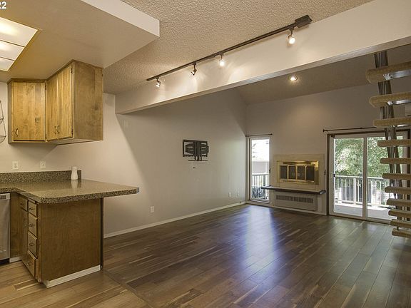 NEW interior paint! Great opportunity with this 2 bed/2 bath Loft style townhome. Open living/dining combo with 20' vaulted ceiling, wood burning fireplace, slider to deck & storage. Kitchen has stainless appliances which are included, eat bar. Laminate flooring. Bedroom & bath on main & upper loft is primary suite with walk in closet & add'l storage room. 2 mini splits. Close to freeway access. Deeded carport parking. Owner carry contract w/good credit & down payment.