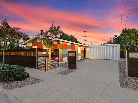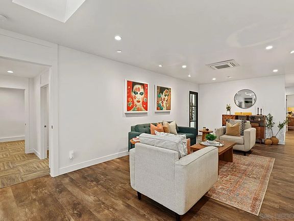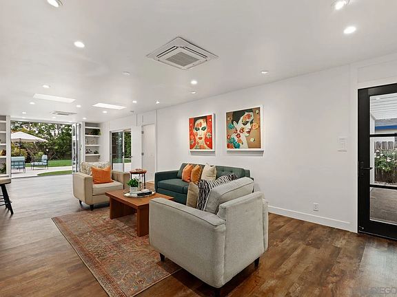 Prepare to be impressed with this stunning and modern single story showplace in Clairemont! This home was taken down to the studs and stylishly renovated throughout offering the finest in luxurious living on an 11,100 sq. ft. lot. Owned and paid off oversized PV solar system, plus all new: electrical, HVAC system (A/C has 6 satellite/mini split units), roof, drywall, insulation, smooth finished walls, interior doors, jambs, baseboards, hardware, windows, skylights, interior and exterior paint, lvp flooring, carpet, fixtures, outlets, ceiling fans and recessed LED lighting with dimmers added throughout. Additionally, new: upgraded 200 amp electrical panel, level 2 EV car charger, camera security system, on-demand water heater, whole house fan, front privacy fencing, oversized detached 2-car garage with alley access. Open concept living with new Chef’s kitchen equipped with custom cabinetry, bar seating, stainless steel Samsung appliances, high pressure formica countertops, decorative shelving including a bar area and opens to the dining room and living room with built-in bookcases and fireplace. There is also a new laundry room with a barn door, plenty of storage, and hallway cabinets. New ensuite primary bathroom with walk-in shower, floating sink, cabinet (including a hidden medicine cabinet), and travertine surround accents. New secondary bathroom with tub/shower combination, vanity and travertine accents. Two additional bedrooms were added on the other wing with separate access.