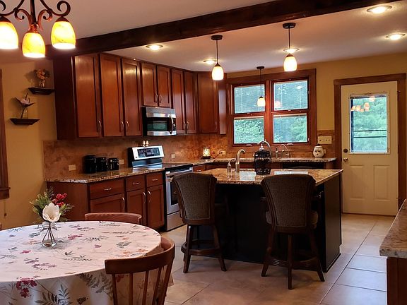 Come see this beautiful 4 bed, 3.5 bath retreat you can call home! It sits on over 5 acres with a stocked pond, wooded trails, a pool, fenced yards and even a greenhouse! Sit on your porch, one of your 2 decks or the 3 season room to enjoy nature! The 2 car garage is heated, has electric, water and even a half bath! Another outbuilding also has electric and water. Inside, you will notice the beautiful, fully equipped kitchen with granite counters and a built-in refrigerator. The living area is open and has wood laminate floors leading to the 3 season room. Next is the mother-in-law or master suite complete with kitchenette, full bath and it's own private deck. Upstairs is the true master with beautiful bath and huge closet. There are also 2 other beds and full bath! A must see!