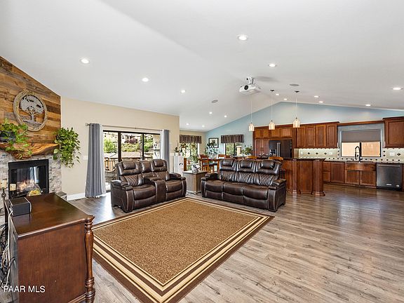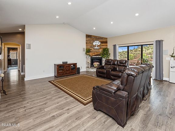 Fully remodeled Yavapai Hills home with a three car garage on just under a half acre lot and backing to HOA open space. Home has long distance views and a brand new roof and HVAC both installed in 2022. Wall to wall remodel completed just a couple years ago including a 700 square foot TREX deck with hot tub (to convey), and new tankless water heater. Everything you could want in a custom new build, but ready to move into now for a fraction of the current cost of building. Enter the main level living from the three car garage through the laundry room and into roughly 2,000 square feet with vaulted ceilings, three bedrooms, two bathrooms and an office on the upper level of the home. CONTINUE... The lower level is ACCESSED FROM THE EXTERIOR ONLY is an additional 1,000 square foot living quarters with its own private entry including a full kitchen, bath, bedroom and living room. Both levels of the home have been completely remodeled in recent years. Luxury vinyl plank flooring throughout both levels of the home. Like new kitchen puts most brand new homes to shame with its attention to luxury and detail. Custom Cabinets by Schiller create a bold stunning look with a gorgeous rounded copper farmhouse sink. Three year old luxury Kitchen Aid appliances throughout kitchen; including refrigerator, wall oven and microwave convection oven above, five burner gas island cooktop, and dishwasher. In-counter pop up power outlets. Composite deck off the great room upstairs providing a spectacular setting for your morning cup of coffee or evening glass of wine. French door entry into the office/study off the kitchen and living room. Living room boasts a 4k ceiling mounted projection television which could be available or possibly convey with a satisfactory offer. In Floor outlets. Multiple accent wood walls in the living great room which also includes a stone accent gas fireplace.. Double door entry into owner's suite with endless views including HOA open space found behind the home and Mingus Mountain in the distance. Enter the owner's suite bathroom through the barn door to unveil a beautiful double vanity with quartz counter tops and soft close drawers and cabinets. Chandelier style light fixtures over the mirror which match the hanging chandelier above the picture perfect clawfoot tub caked in natural light from the frosted glass block window it sits next to. Along with the tub the bathroom also features dual head marble walk in shower, water closet, and generously sized walk-in closet. The two guest bedrooms on the main level are nicely sized rooms, with a guest bath including a recently installed vanity with granite counter tops. Downstairs has an additional bathroom and granite vanity as well. On the lower level you find an entirely separate living space, showcased with a 700 square foot Trex deck and built in hot-tub which will convey with the sale. Blue pine accent wall, trim and doors, ceiling fans. Brand new windows. Marble walk in shower. The living space or apartment is currently used as a mancave and office. It includes a full kitchen, double oven range with five burner stove and overhead microwave, this kitchen is fit for a primary residence complete with butcher block counter and its own pantry as well. Off the lower level you have a crawl space including a concrete pad to provide wonderful storage and W/D hookups for a stackable unit. Concrete area currently used as a small gym. Tankless water heater is also found in the crawl space as well as a plumbing lift system.
