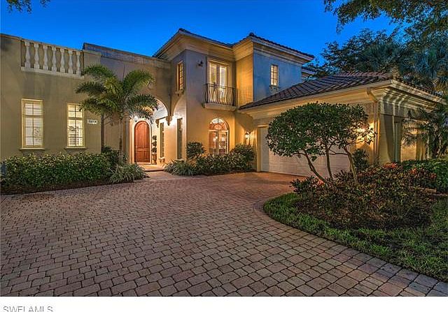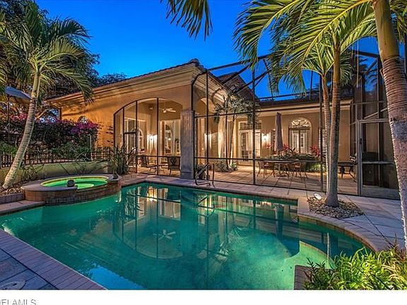 H.10268 - Villa is nestled into an oversized south-facing lake view in the quaint neighborhood Las Palmas. Dramatic wooden 10' front door, soaring rotunda and spiral staircase leading to the second and third suites. A total of 3 beds + den and 3.5 baths, with a first-floor master suite. A gourmet kitchen complete with gas cooktop, pantry and built-in wet bar. Oversized crown molding and baseboards, gorgeous tile flooring, volume ceilings, home-wide sound system, security system. Romantic lanai which includes a dining area and a separate elevated deck. reminiscent of a charming Italian village, pool with hot tub gorgeous views of the lake as well as The Colony golf course. Enjoy a huge array of amenities at Pelican Landing and The Colony Golf and Bay Club including a34-acre private beach park, state of the art fitness center and spa, tennis, pickle ball, bocce ball, canoe park, and private waterfront dining at The Bay Club. Several elective private championship golf options as well. EQUITY SPORTS MEMBERSHIP TO GOLF CLUB INCLUDED! Inquire for details.