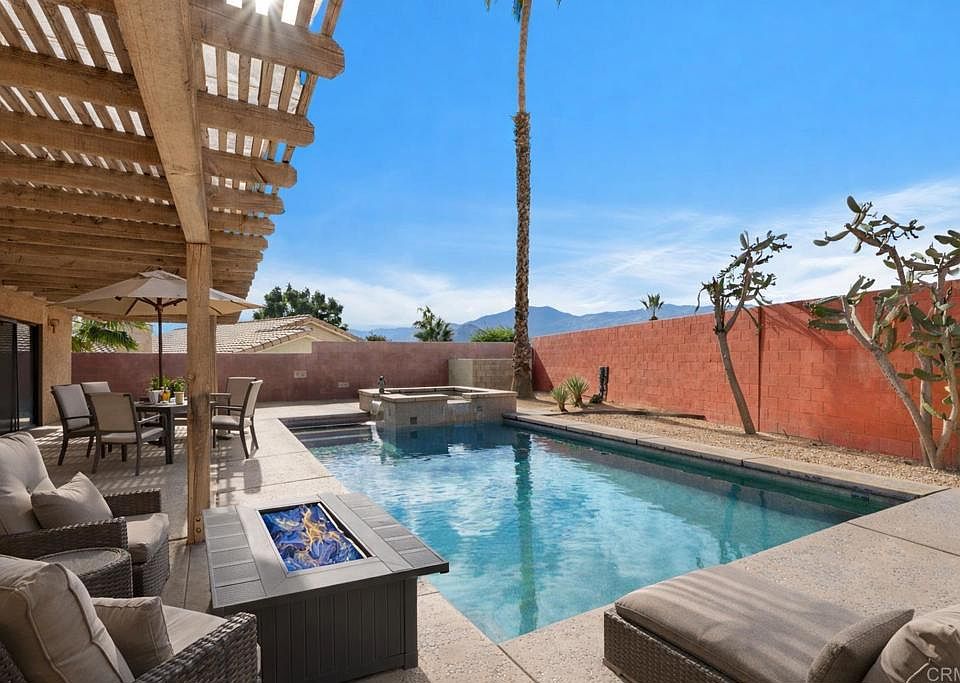 Splash into fun with this open and airy POOL home nested in a quiet La Quinta neighborhood – and NO HOA! You must see the serene mountain VIEW! It’s fantastic! Long-wearing HARDWOOD FLOORS are found throughout the home, except tile in the kitchen area. The living room is spacious with a wood-burning fireplace. The kitchen features vintage European-style cabinetry, with a step-in pantry and island with vegetable sink. NEARLY NEW KITCHEN APPPLIANCES sparkle and the interior was JUST PAINTED in a soothing desert palette. In addition, volume ceilings create an airy feeling throughout the open-concept plan. There are THREE FULL BATHS! The primary BATHROOM was REMODELED to reflect a European aesthetic with smooth-front cabinetry and a fabulous glassed-in shower. Outside, revel in the large pool area, with tempting spa and serene mountain views. The large patio and deck area accommodate any type of gathering. A cozy firepit completes the picture. You will also be so close to the great shopping of in La Quinta. Rare opportunity for a move-in ready pool home with 3 baths – and no homeowner association! See it today!
