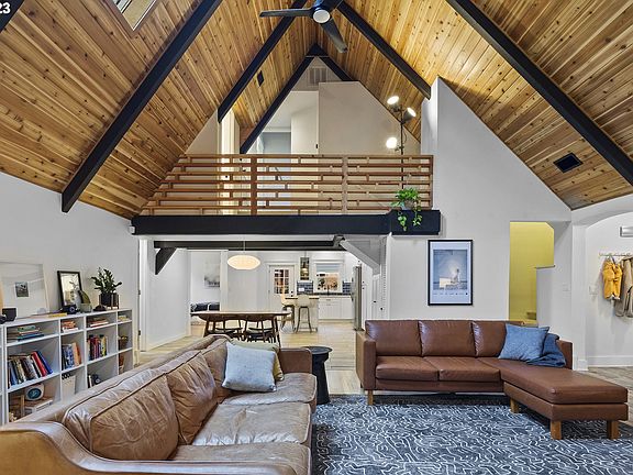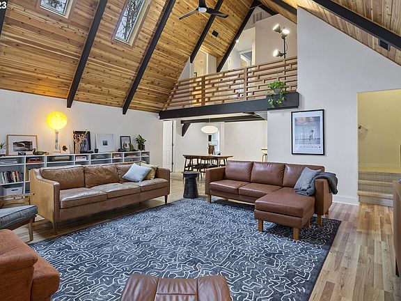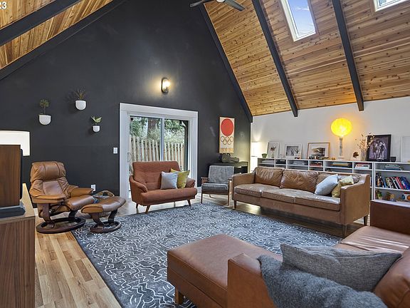 This is a one of a kind A Frame with mid century vibes in the sought after Bridlemile neighborhood. A hidden gem situated at the end of a cul-de-sac. Updated to perfection & both cozy & hip. Vaulted wood ceilings, exposed beams & hardwood & tile floors. Fabulous main level flow with open spaces, updated dream kitchen & baths. Large outdoor entertaining area w/fireplace table & deck in fenced & level back yard. A few short blocks to Bridlemile elementary & close to parks, restaurants & shopping.