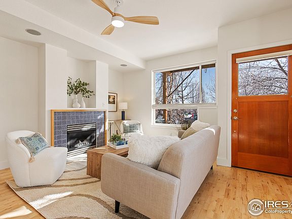 Peaceful park-front living awaits in this charming 3BD/3.5BA end-unit townhome featuring sun-splashed contemporary interiors, a home office, multiple outdoor spaces and tons of storage directly across from Holiday Park. A lovely front porch with park views welcomes you inside this 2,101SF residence filled with tall ceilings, gleaming hardwood floors, and large windows on the eastern, southern and western exposures. The main floor's open layout flows past an inviting living room with a fireplace and modern ceiling fan and a spacious dining area. Ahead, the bright kitchen boasts wood cabinetry, granite countertops, tile backsplashes and stainless steel appliances. An adjacent powder room and pantry storage add convenience, while an easy-care turf yard right off the kitchen makes al fresco dining irresistible. Head up the stunning wood staircase to explore the sun-drenched owner's suite, featuring an oversized Elfa closet and a windowed en suite bathroom with a double vanity and large tub/shower. The secondary suite on this level includes its own Elfa closet and en suite bath. A large hall closet with washer-dryer hookups completes this level, while a spiral staircase leads to the top-floor loft area, the ideal spot for a home office or lounge area next to your dramatic rooftop deck. Imagine gathering with friends on this spacious pergola-topped retreat wrapped in jaw-dropping views of the Flatirons and surrounding mountains. On the finished lower level, you'll find a flex room perfect for a gym or family room, plus additional storage and a third en suite bedroom with two closets and an updated bath. This beautiful Boulder home conveys with a two-bay detached garage for convenient off-street parking. In this ideal North Boulder location, Holiday Park is right across the street, and miles of trails, Foothills Community Park and Wonderland Park are just minutes away. Enjoy nearby NoBo favorites or explore Downtown and Pearl Street amenities all within easy reach.