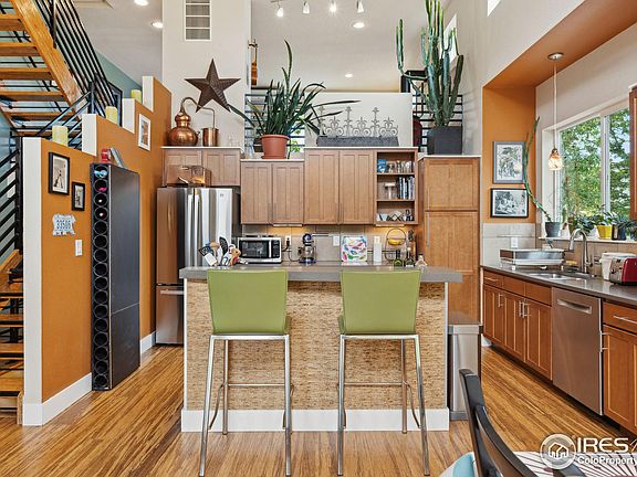 Solar Row - Eco-friendly Retreat. This beautifully designed, energy-efficient paired home is equipped with a full solar electric system and solar hot water, offering an environmentally conscious lifestyle without sacrificing convenience or luxury. The home is powered by a 2.75 kW solar electric system, providing ample electricity for everyday needs, except during rare snow-covered periods. The solar hot water system efficiently heats the home and supplies hot water for showers, dishes, and more. For peace of mind, a conventional 40-gallon backup water heater is in place, and the home remains connected to the grid for power when solar energy isn't available, ensuring uninterrupted comfort day and night. Each level is efficient. Step up a half flight into the spacious living room, featuring large windows, high ceilings and abundant natural light create a warm, inviting atmosphere, with direct access to a private deck shaded by grapevines-ideal for morning coffee or afternoon relaxation.This three-bedroom townhome includes a primary suite with an ensuite bathroom, offering a serene retreat with modern finishes. A full bathroom serves the secondary bedrooms. Additionally, a powder room on the main floor adds extra functionality for entertaining. A full-size stackable washer and dryer are located in the top-floor laundry closet for added convenience. The lower level has rough-in's for an additional bathroom.The basement theater is equipped to showcase a 75-inch screen and surround sound for an immersive experience. The gourmet kitchen, with high-end appliances, makes preparing anything from quick snacks to elaborate meals effortless. Located in one of North Boulder's most walkable neighborhoods, Solar Row is just steps away from coffee shops, bakeries, restaurants, and nearby parks. With easy access to hiking trails and a nearby bus station connecting to downtown Boulder and Denver International Airport, this home offers the perfect blend of lifestyle and convenience.