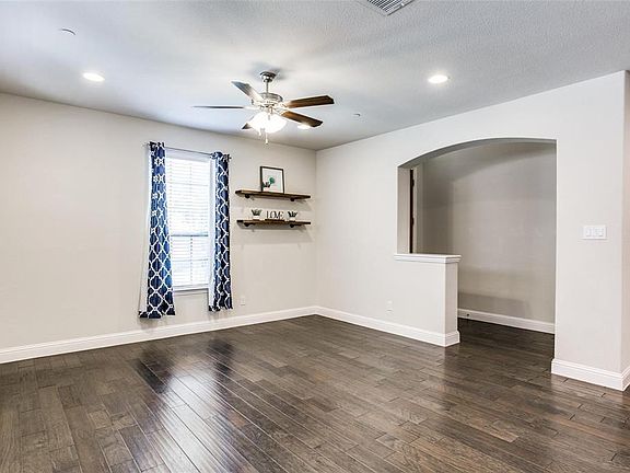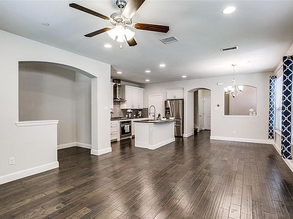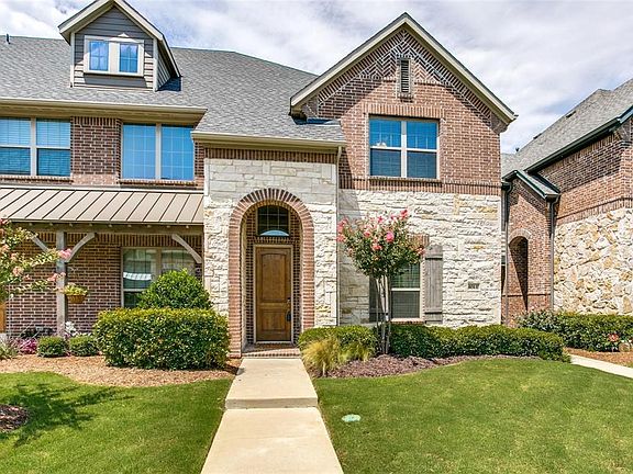 Immaculate, low-maintenance two story end-unit townhome in popular Mustang Park with fantastic open floor plan concept! Modern palette with engineered wood floors, two inch blinds and tons of natural light. White cabinets and nickel hardware in kitchen with stainless steel appliances, subway tile backsplash, gas cooktop, built-in microwave and large island with bar seating opens to stacked dining and living room. Wrought iron balusters lead upstairs to open loft/gameroom, perfect for exercise or home office, two secondary bedrooms and master suite with soaring ceilings, HUGE walk-in closet with builtins and seasonal racks, his and her sinks. Community pool, beautiful pond with fountain and just minutes to Tollway, 190, Legacy West, The Star, Grandscape, and 25 minutes from Downtown! Lose Yourself In The Fully Immersive 3D Tour at http://bit.ly/4654Rhett