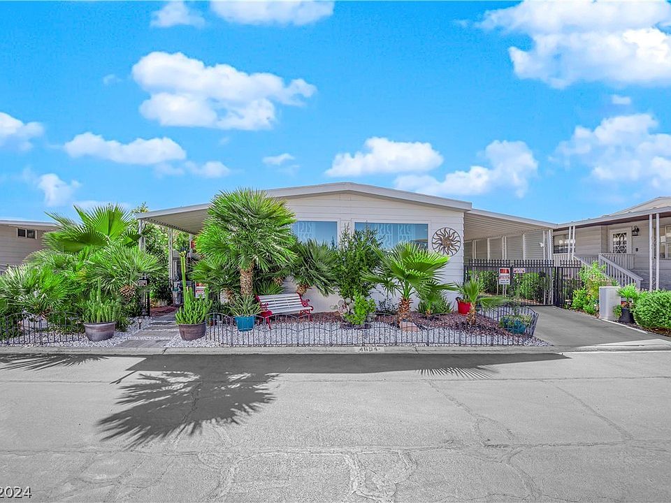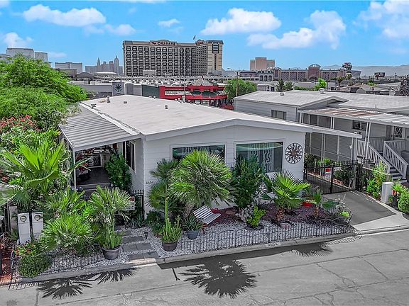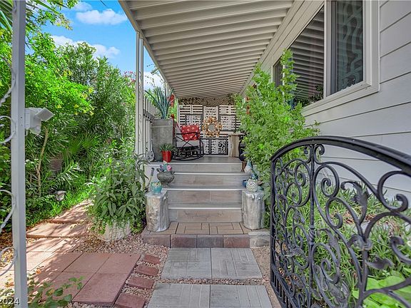 Welcome to the lush oasis of 4654 Royal Ridge - strip views, low costs & lively amenities. This 2 bed, 2 bath home is located in gated Royal Ridge Estates, only 10 mins from the Airport & Las Vegas Strip. The community offers abundant amenities - swimming pools & spa, tennis courts, RV parking, social calendar & more. Water & sewer are included in your HOA! (Property taxes under $250 yearly) Inside, you will find tasteful luxury vinyl flooring & accent walls. Large electric fireplace & cabinets continue to add to this homes charming character. The kitchen is updated with a new copper hood vent & white cabinets. The master has views into the green backyard and its own separate A/C. Spacious master bath with wide vanity & soaker tub. Almost every room has views of the multiple verdant patios. Whether you are on the front porch, side yard or enjoying the strip views in the backyard - you are surrounded by lush mature landscaping rarely found in Vegas. New AC, roof, water heater & more!