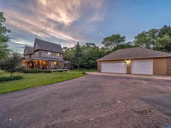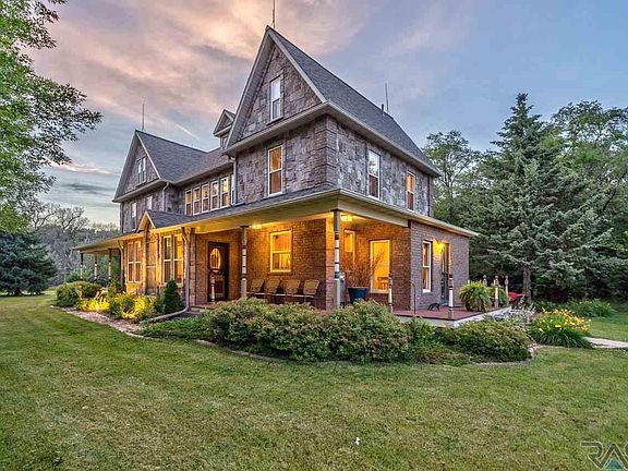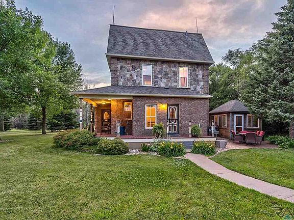 Hobby farm, hunter or horse lover acreage buyers, here it is! This stunning farm house was originally built in 1908 near Centerville, SD and moved on-site in 1989. It has been meticulously and completely restored. Updates include a second floor laundry, brick and stone exterior, wiring, plumbing, Trex® decks, custom kitchen, hail rated shingles, new storm windows and more. The old charm is still present with original hardwood floors, stunning woodwork, stained glass window, transoms, and a unique tin ceiling! Enjoy evenings sitting on the wrap-around porch or in the quaint detached gazebo, perfect for a 3 season getaway or entertaining space. The 28x32 TWO STORY hay barn features concrete floors for shop lovers or home hobbiest, as well as a horse stall, corral and electric fence in the back. Enjoy the triple garage with attached indoor/outdoor dog kennels. With over 7 acres, this property has privacy with mature trees, and all the convenience of location and paved roads.