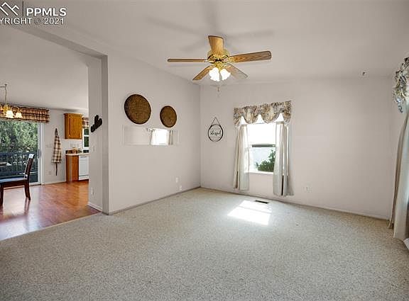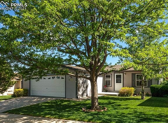 Main level living with 3 bedrooms, 2 bathrooms, an oversized two car garage, and central air conditioning! ORIGINAL OWNER! Master bedroom with adjoining 5-piece master bath, double vanity, walk-in closet, stand-alone shower, and soaking tub. The well-lit kitchen has plant shelves, laminate floors, plenty of natural lighting, ample counter space, lots of cabinets, and a pantry! Don't miss the gas range oven and a sliding glass door the leads to the lovely wood back deck; enjoy relaxing on the shaded deck in the late afternoon! All kitchen appliances remain with the property, as do the washer and dryer. New roof and exterior paint in 2016, and the water heater and central AC are only 4 years old! Ample visitor parking directly behind the house! An automatic sprinkler system waters the lawn which is the envy of the neighborhood - especially the gorgeous tree in the front yard! The 23x19 garage has direct access into the house, built-in shelving, a service door to the front porch, and a garage door opener! Unlike other homes in the community, you can easily fit two cars in the garage and two more cars on the driveway! The location is fantastic - Peterson AFB is only 9 minutes away, and all the shopping, dining, and entertainment you could want is only 5 minutes away on Powers BL! Rocky Mountain Classical Academy is right across the street on Antelope Ridge. The neighborhood offers many amenities to its homeowners; clubhouse with meeting room, media center, lending library, exercise room, heated pool and toddler pool (open Memorial Day to Labor Day) ~ The Chateau at Antelope Ridge offers a community feel rarely seen in other communities ~ Near shopping -Groceries, Costco, etc.