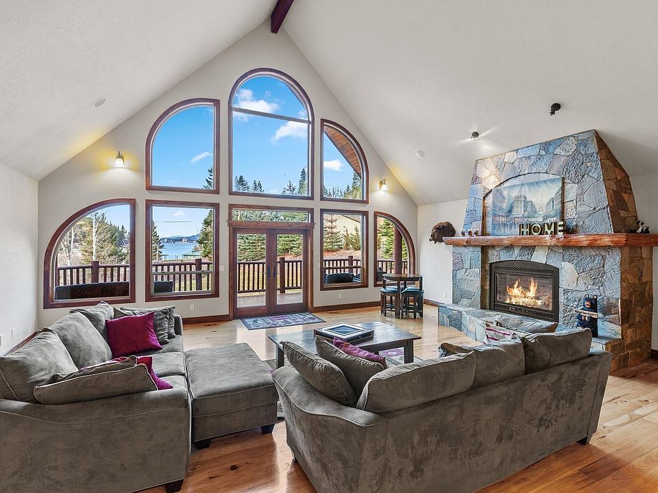 - Description: stone fireplace, vaulted ceilings