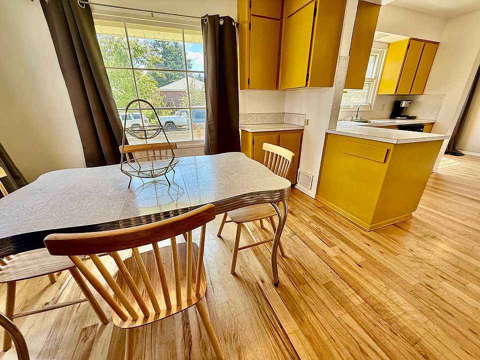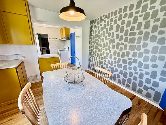 Stylish & sweet 1950's house in the Woodstock neighborhood to rent. Relax with your family at The Yellow House. This peaceful 3 or 4 bedroom home in SE Portland's charming Woodstock neighborhood is just two blocks from a beautiful off-leash dog park and only minutes from restaurants, food carts, ice cream shops, bars, supermarkets, and boutiques. this house can comfortably sleep 8 people. The home features a full kitchen, washer, dryer, fenced yard, Wi-Fi, TV, dishwasher and more. We love your pets your first pet stays free! Any extra set is $35 per month. This is a furnished mid term rental so it's perfect for a 1 6 months stay. The Space The Yellow House sits on a quiet, south-facing corner lot in the Woodstock neighborhood. It features a generously sized, fully fenced front and side yard with ten mature fruit trees Asian pear, plum, apple, pear, and peach planted by my mum and me 15 years ago. The yard is ideal for dogs, and the neighborhood is very quiet and walkable. -3 Bedroom . -Extra room that's big that could be used as an home office, kids play room, TV room or 4th Bedroom. -1 Bathroom with walk-in shower. -Great quiet location convenient to Woodstock Bvld, the rest of SE Portland & Downtown Portland. -Lots of Parking with 6 on street places. -Completely fenced yard in all around the home. -Newly refinished Hardwood floors. -Newly painted Kitchen Cabinets and entire house. -2 bedrooms with closets down stairs with hard wood floors -Working fire place -S.E. facing corner lot. -12 Fruit trees on property. Various apples, asian pear, plums, peach and pear. -Dogs and Cats are welcome and loved -Washer and Dryer on site $5000 per month Rent includes. Everything. 1 Month mid term Fully Furnished 3 Bedroom home.