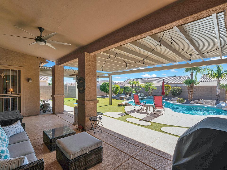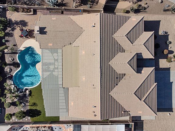 Beautiful 4bed/2.5 bath/3 car garage single level with tasteful upgrades & gorgeous backyard/sparkling pool! A must see!! HVAC is a variant cooling system with Nexia enabled controls ($28K) (2-3 yrs old). Irrigation redone in 2021 ($6K) with pvc piping & remote control zones throughout including in the garden raised planter beds! Entertainer's dream open floorplan with built-in bar in dining area & pool table conveys. Lots of large windows bring in great light! South facing resort-style backyard has impeccably maintained HEATED (heater installed 2021) pebble pool with rock waterfall & Pentair filtration system (WIFI compatable), extended patio w/aluminum pergola & misters for great summer shade/cooling, outdoor lighting, extended paver patio & artificial turf yard, 3 citrus trees (tangerine, lemon & lime). Other features include gas fireplace in family room, no carpet - tile & laminate/wood-look flooring, spacious split master bedroom w/large walk-in closet, separate shower & jetted tub, double sinks, exit to outside. Lots of custom features throughout home. Kitchen has gorgeous granite counters (same granite in baths also), white cabinets, R/O, large island, Samsung French Door refrig/freezer (conveys), Bosch dishwasher, Samsung glass-top range, Whirlpool built-in MCW & built-in desk. It is open to the family room. 4th bedroom currently an office with nice built-in's. Security doors, cabinets in garage, laundry room with plenty of cabinets & counter for folding clothes. Washer/dryer does not convey. Conveniently located 3 miles west of Norterra & I-17, 3 miles north of 101. Lots of shops & restaurants nearby! This place is a dream! You won't be disappointed!