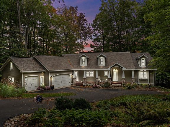 Shanty Creek Resorts. This alluring, one-owner, meticulously maintained home, is nestled among the trees on the award-winning Legend Golf Course. Large, spacious rooms with natural light and beautiful views of the pond feature and the 11th hole of the golf course. The living room is welcoming and warm with a gas fireplace, and beamed ceilings taken from reclaimed wood from an old barn in Mancelona, MI. The reclaimed wood carries tastefully throughout the home, with the perfect ratio of granite countertops in the kitchen and wood countertops on the island. In the office, the floors, desk, and bookshelves are all artfully designed using the barn wood. This home was built for family gatherings and entertainment. Enjoy the 3+ seasons room off the dining room, which leads out to the wraparound composite decking, where you can hear the waterfall’s gentle lullaby in the summer. There is also a Pergola and firepit for even more family fun. This home has luxurious furnishings (many antiques) which are included with the home, minus personal items. This home is located in Summit Village, which comes with Beach Club privileges on beautiful Lake Bellaire. Take a quick golf cart ride to any of the 3 Resort Villages, for golfing, dining & shopping and skiing in the winter months. Start making family memories now!