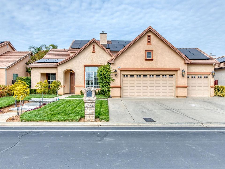 Waterfront living in Quail Lakes! This beautiful 4 bedroom, 3 bath home boasting lake views from almost every room in the home. Well-appointed with light oak flooring in main living areas, custom built in bar in formal dining room with wine and beverage refrigerators, neutral color palette throughout, and designer light fixtures and ceiling fans. Open concept living room with gas fireplace and wall of windows overlooking the serene backyard and the lake, gourmet kitchen with large center island, abundant cabinetry, and SS appliances. Private downstairs primary suite w/ large closet and spa-like bath w/ jetted tub and step in shower. Another bedroom and full bath completes the downstairs. Upstairs features a spacious loft and 2 bedrooms with awesome views of the lake. Premium lake front lot over 10,000 sqft offers 3 car garage, extended driveway, and large backyard with plenty of room for a pool. Owned solar! Quail Lakes is a one-of-a-kind gated community offering 24 hr security, a beautiful lake, club house, Olympic size pool, parks, 2 miles of private trails through natural reserves, and community events offered throughout the year. Resort style living you don't want to miss!