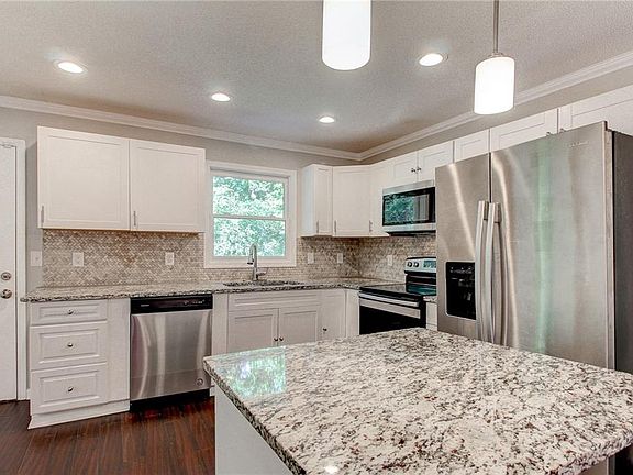 - Kitchen Features: Eat-in Kitchen, View to Family Room, Stone Counters, Kitchen Island, Cabinets White