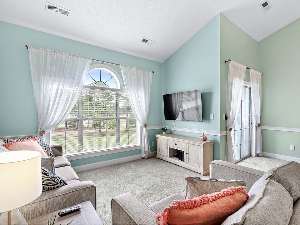 Golf course views from this one bedroom, one and a half bathroom condo! This top (3rd floor) condo is a perfect quiet getaway for those looking to relax in Myrtle Beach. The unit has been recently painted and decorated with a fresh modern look. You'll enjoy the powder room in the condo that is great for guests or those who don't want to share vanity space. Vaulted ceilings make the unit feel larger and like home. The kitchen is fully stocked and ready for meals. The living room and bedroom tv's are both smart Roku TV where you'll have access to full cable and any streaming services you might have. WiFi is included in the unit as well. The bedrooms had a queen size bed with ample storage space for personal belongings and clothing. In the full bathroom there is a full size stackable washer and dryer available for usage. You'll only need personal belongings, so get packing and enjoy the views this condo has to offer! No smoking allowed. No pets. Guests must abide by HOA rules. 1 month minimum and up to 3 month rental allowed. $135 cleaning fee. Availability now through January 1, 2025