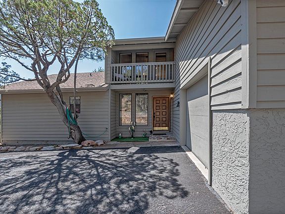 Perched to capture amazing views of the town, surrounding mountains and beyond, this home offers a stunning setting. The spacious living room features a wall of windows to showcase the views, along with a beautiful rock-faced fireplace, vaulted ceilings and hardwood flooring throughout. The remodeled kitchen includes stainless steel appliances, a breakfast bar and opens to a wonderful deck overlooking the fenced yard with low maintenance faux grass- ideal for pets or children. Upstairs you'll find a large open loft perfect for an office or extra sleeping space, a guest bedroom and bathroom, plus a versatile bonus room. The lower (main) level offers the primary bedroom with ensuite bath, an additional guest bedroom and bathroom and access to the oversized one car garage. Additional parking is available with a circular driveway. The property includes two lots for added space and privacy.