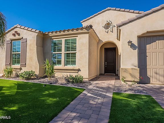 Experience a vibrant lifestyle at one of the best master-planned communities in Arizona. Home to beautiful neighborhoods, award-winning schools and innovative amenities! 4 bedrooms (split plan), 2-1/2 baths, 2,845 sf. Huge 10,000 sf lot. This home is a stunner with tons of upgrades including wood shutters, huge patio slider, Quartz in primary bath/kitchen, luxury ceramic wood-look tile, fans, gas fireplace and more! Great room concept open to Chef's kitchen boasting gas cooktop, gorgeous cabinets/backsplash, double ovens, Butler's pantry, oversized island/bar and breakfast nook. $90,000 resort backyard offers a heated pool with Baja shelf and swim-up bar, water feature, turf with cooling sprinklers, spa, outdoor kitchen/BBQ, Ramada with TV, gas firepit. Perfect for family gatherings! Luxurious primary bedroom/sitting area and spa bath. 3 car garage, large mud-room and beautiful curb appeal. Convenient to dining, shopping, Phoenix-Mesa Gateway Airport, excellent schools, near the 101, 202, 60 frwys all in the Thriving Gateway Corridor. Eastmark is something special with incredible amenities such as numerous parks and playgrounds, walking trails, tennis courts, community pool, splash pads, skate park, state of the art clubhouse, and ample community events. Welcome home!