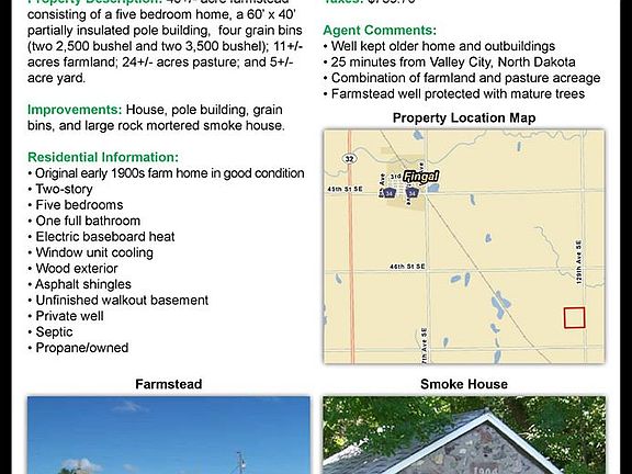 Now looking at offers!! 40+/- acre farmstead consisting of a 5 bedroom home; a 60'x40' partially insulated pole building; 4 grain bins; 11+/- acres farmland; 24+/- acres pasture; & 5+/- acres yard. **Well kept older home & outbuildings. **25 minutes from Valley City **Farmstead is well protected with many mature trees.