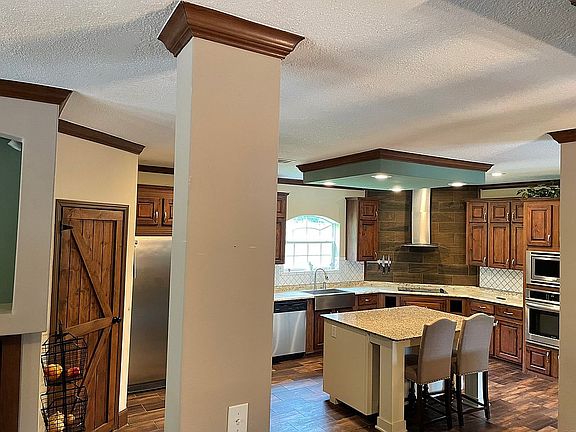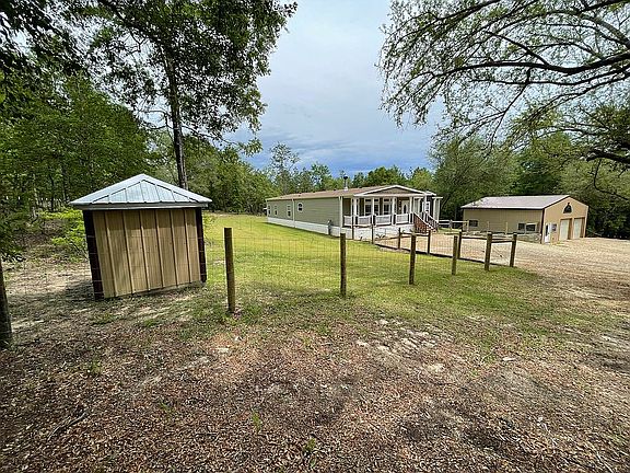 Beautiful homestead on 5 acres. 3/4 acre zoysia lawn, 500 foot freshwater well, and large pond suitable for swimming. Several fruit and pecan trees are growing along with cultivated blueberry plants. A grape arbor is becoming established with muscadines. The acreage is established with mature trees, including several live oaks. The manufactured home boasts an open floor plan with the fireplace visible from the living room, dining room, and kitchen. The second living room is also open to the kitchen. The master suite has a walk in shower, garden tub, and private toilet room. Exterior buildings include a pump house, 8x24 chicken coop, and 30x30 detached garage. The detached garage has hurricane rated roll up doors, full electrical service (including 220), and a 300 square foot loft. 15 minutes from either Publix in Crestview, and less than 30 minutes to Duke Field/ Camp Simons. The home is a Live Oak Homes modular build. It has 9 foot ceilings and 2x6 framing. An assumable VA rate of 2.25% is available.