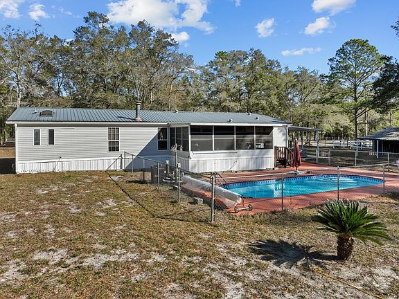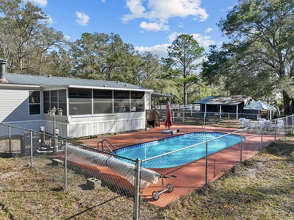 Welcome to 4659 SW 56th St. in Trenton, FL, where country charm meets modern living on a spacious 5.14-acre estate. This property is an oasis of calm, surrounded by majestic oak trees that provide a serene backdrop for a life of peaceful enjoyment. It's the perfect setting for those who appreciate the quiet of the countryside while still valuing the conveniences of modern amenities. A notable addition is the RV hookup, enhancing the property's appeal for those who love the open road yet seek a stable base. The heart of this home is its welcoming sunroom, a screened sanctuary that offers views of the lush surroundings and the heated swimming pool. It's a versatile space where mornings can be spent in quiet reflection with a cup of coffee, or evenings relaxing in the gentle breeze. The home's interior is characterized by an open and airy living space, where natural light illuminates the room, creating a warm and inviting atmosphere for family and friends to gather. The master suite is a true retreat, featuring a very large walk-in closet that serves as a luxurious addition to the space, providing extensive storage and organization options. This feature underscores the thoughtful design of the home, where comfort and convenience are paramount. For those with a passion for equestrian pursuits, the property doesn't disappoint. It comes equipped with horse stalls, a lighted arena for evening rides, and vast pastures that are fenced and cross-fenced, offering a comprehensive setup for horse care and riding enjoyment. A highlight not to be missed is the hot tub, an inviting feature that promises relaxation and leisure. Positioned to offer privacy and tranquility, it's an ideal place to unwind under the stars, adding an extra layer of luxury to the outdoor amenities. Located conveniently close to shopping and essentials, this home offers the best of both worlds: the peace and privacy of rural living with the ease of access to necessities. The current owners have invested love and care into the property over the past decade, including the addition of the heated pool for year-round enjoyment, making it ready for new owners to enjoy. Drone footage and a 3D walkthrough are available to provide a detailed and immersive view of this unique property. This home is more than just a place to live; it's a lifestyle choice for those seeking tranquility, comfort, and a touch of luxury in their everyday lives.