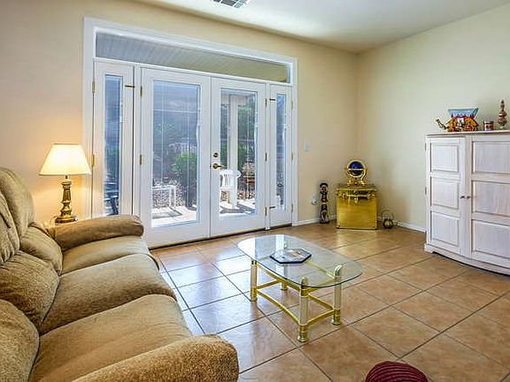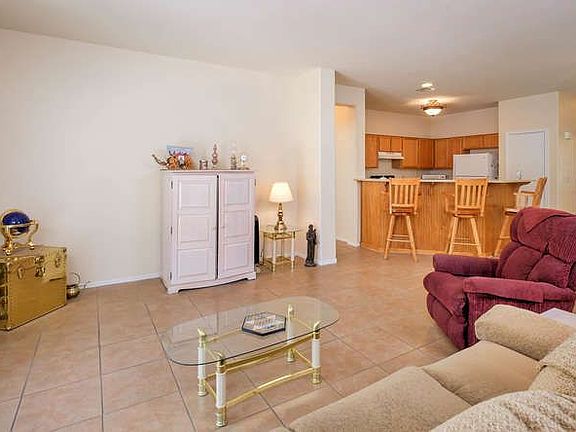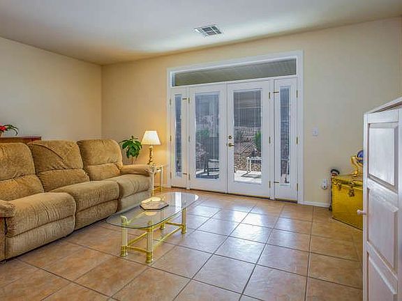 HOME HAS BEEN FRESHLY PAINTED THROUGHOUT ENTIRE HOME !!! Beautifully tiled entryway, tile in kitchen, dining area, living room, master bedroom, guest bedroom and den. French Doors lead out to the east facing patio which has the highly desirable east facing orientation. Patio is also covered with an alumawood awning.. Backyard is fully fenced and has two side gates. Kitchen has lovely corian countertops with a raised breakfast bar with three captains chairs for bar stools. Master Bathroom has sunken tub, separate shower, double sinks with large vanity area and walk-in closet. Solar Sunscreens are on some of l the exterior windows which provide for privacy and lowers the electricity bills. Washer and Dryer are included with this property. Beautiful armoire ($2,500 value) will be left in the den, so that the den may be used as a 3rd bedroom. BUY WITH CONFIDENCE ! ONE YEAR HOME WARRANTY IS INCUDED WITH THIS PROPERTY