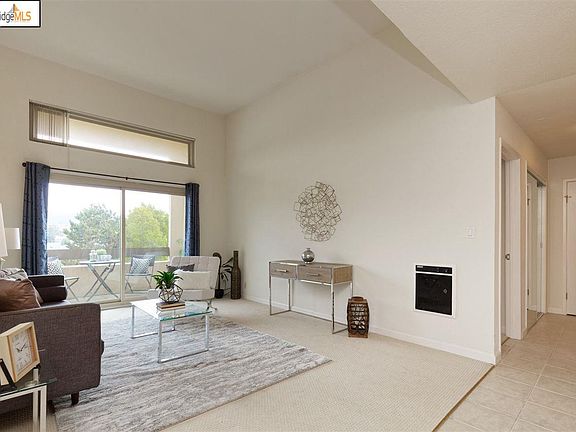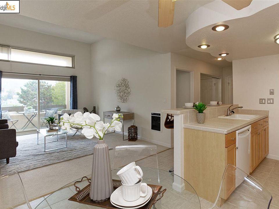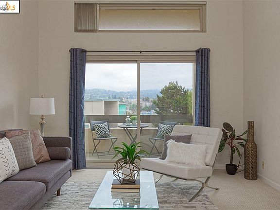 Staged. FABULOUS, RARE, TOP FLOOR home with vaulted living room ceiling, large balcony and serene views of the East Bay Hills. Home faces East so is shielded from the freeway noise. Bedroom window and balcony sliding door are upgraded, vinyl clad, dual pane. Kitchen features an expansive counter with lots of cabinets and a breakfast bar. One car deeded garage parking included. There are two laundry rooms on every floor with 2 washers and 2 dryers in each laundry room. The Crescent Villas building has been seismically retrofitted and features a pool and a club house. 86 Walk Score, 77 Bike Score. Trader Joe's is only 0.6 miles away.