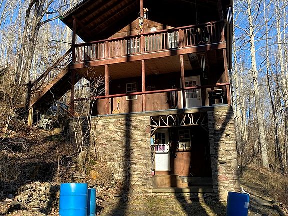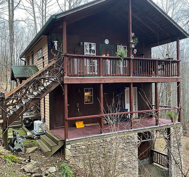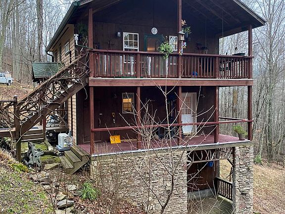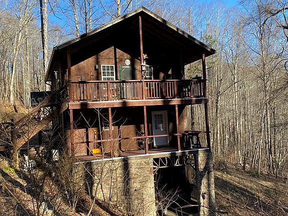 This unique, custom-built, 2 bedroom 1 bath stone-trimmed home on 2+ forested acres is a great investment opportunity or full time retreat on Baines Mountain 10 minutes from Bryson City. Enjoy cool summer-temps at 3,400 ft or travel nearby to refresh in Nantahala River or Fontana Lake. Three-storied house tucked into a forested slope has privacy, serves as a low-maintenance primary home or a rental, has play area or extra storage in custom she-shed with sheltered deck, could serve for hobbies, storage, or extra sleeping spot! 2 mini-splits heat and cool, living room has stone hearth and Buck stove keeping cozy warm on snowy nights. Has private well. Appliances: gas-top stove, double oven, refrig, ceiling fans, dryer. RV height carport for camper or roomy parking and shelter. Terraced landings ready for gardening. Two covered decks for enjoying views and wildlife.