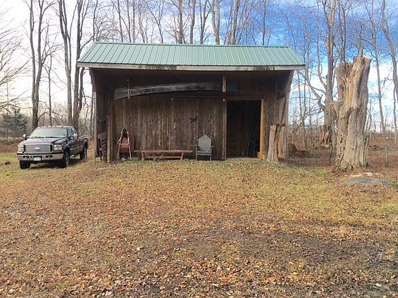 ABUTTING STATE A long private road through the woods leads to a very secluded location featuring a solor powered Hunting camp, 2 storage buildings, one housing a nice work shop, generator house and a hunting tower that has to be seen to believe. There is a nice year round building site on an open meadow with electricity and frontage on a maintained town road. Located on 44+ acres with a nice balance of meadows and woods plus a state fishing pond across the road. Priced to move $115,500.