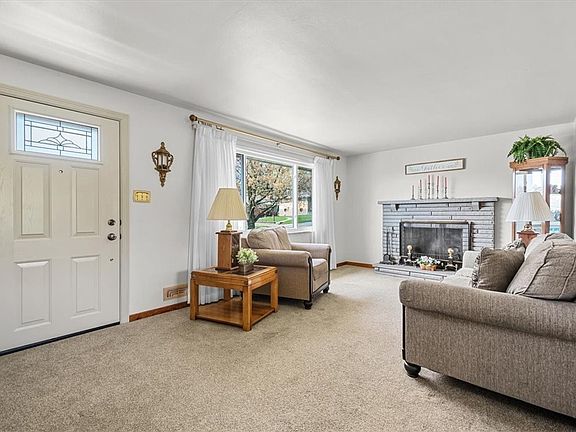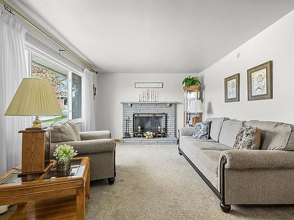 Welcome to this inviting brick ranch home with a delightful curb appeal! Step inside to find a sunlit living room boasting a picturesque window and a cozy brick fireplace as its centerpiece. The living area seamlessly transitions into the dining space, offering a tranquil view of the backyard. The kitchen has been tastefully updated with oak cabinets and modern appliances, providing a comfortable space for dining. Down the hallway, discover the spacious master bedroom featuring generous closet space, alongside two well-appointed bedrooms. A full bathroom with a tub-shower combo and ceramic tile flooring serves the bedrooms and guests alike. Descend to the lower level to find a versatile game room, complemented by a convenient half bathroom, laundry area, ample storage, and garage access. Outside, the property boasts a generous lot size and a charming concrete patio, perfect for outdoor gatherings or relaxation.