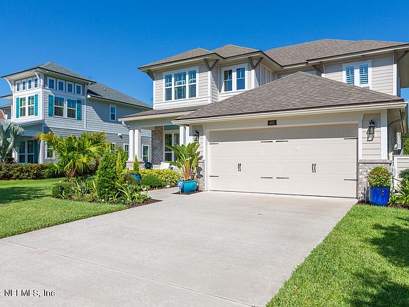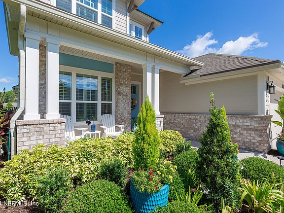 This 4 bedroom 3.5 bath Dostie Home (Hemingway Prairie) floor plan is located in the highly desirable neighborhood of 20 Mile. Beautiful Mohawk hardwood and tile floors downstairs. Kitchen features built in banquette, upgraded soft close cabinetry with pull out drawers/shelves, GE appliances with matte finish, gas cook top, french style refrigerator, oven/microwave tower, subway tiled backsplash, walk in pantry, large center island with custom mill work, quartz countertops and new pendant lighting! Expansive great room featuring custom ceiling beams, built ins, disappearing triple sliders leading to the screened in covered lanai overlooking the gorgeous lake view! Spacious laundry room with cabinetry and cubbies! Primary features hardwood flooring, tray ceiling and his and hers walk in closets. Beautiful Master Bath with separate vanities, soaking tub, frameless shower with 2 shower heads w/ built in seating and niche. Downstairs office with custom shelving could be 5th bedroom. Downstairs renovated marble powder bath for guests. Stairwell features hardwood flooring, square baluster with spindles and under stair storage space! Second floor features large loft, three bedrooms and two full baths, one with ensuite bath. Exterior includes gutters, beautiful Sylvester Palms, expanded screened lanai, custom front porch! The double car garage with a 6' extension completes this spacious and beautiful family home! Ask about our Preferred Membership to Gate Hospitality - Ponte Vedra Inn & Club, The Lodge & Club, Epping Forest, and The River Club.