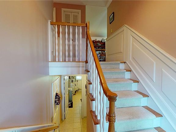 Ask Agent about wood floors under carpet, Full inspection report is available to view. Meticulous Four Pillared Residence w large covered porch runs the length of the property. 1/3 acre tree-lined lot against woods.  "Must See Highlight" - 2nd Floor Upper Attached Custom Built Outdoor Deck Perched in the trees is an extension of the kitchen & your private sanctuary.  Dual bay garage each equipped with Lift-Master Garage Door Openers w Built-in Wi-Fi. Massive Lower Living Level w living room w gas fireplace, bedroom, laundry & bathroom. Perfect In-Law Quarters or Multi-Living Space. Upper Living Area Newly Renovated Eat-In kitchen, granite, back-splash,slow-close cabinets, negotiable appliances & Walk-Out Perched Balcony. Main floor living room, dining room, full bath, 3 bedrooms 1 w "on-suite" bathroom. Please Take Note - "Custom Pegged" Floors exist underneath the living room carpet.  High-Efficiency Furnace in 2009, 30-year roof 2003, Heated Garage, triple protection sump pump, and much more.  Full Inspection recently conducted on the property and is available upon request.