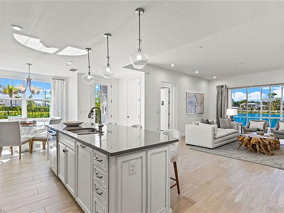 The Naples Parade of Homes award-winning Carmel coach home is a 1st floor end unit home that is designed to enhance your lifestyle. With 2 bedrooms, 2 baths, and a 2-car garage, this open and airy plan has a natural flow. A beautiful designer kitchen features quartz counter tops in Carrara Breve and 42” upper wood cabinets in Linen, an island with breakfast bar, and an adjacent sunlit dining area. The kitchen overlooks the airy Great Room that is highlighted by expansive sliding glass doors that lead to the covered, screened lanai. The owner’s suite is spacious and adjacent to the private owner’s bath with a walk-in closet. The 2nd bedroom features front and side windows and is adjacent to the 2nd full bath. Direct access to the home is provided through the covered porch or through the 2-car garage. Great incentives available for a limited time only. Incentives, pricing, dimensions and features can change at any time without notice or obligation. Photos, renderings and plans are for illustrative purposes only, and should never be relied upon and may vary from the actual home. The photos are from a furnished model home and not the home offered for sale.