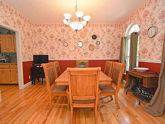 - Dining Room Feat: Chandelier, Chair Rail, Wood Floor, Window Treatment