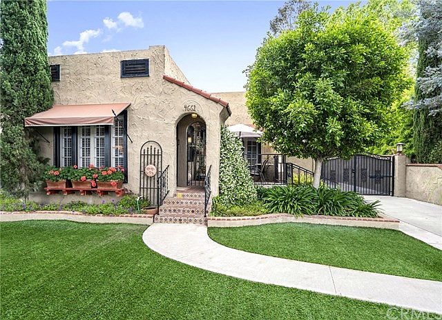 Incredibly charming 1926 Spanish Bungalow in the "Palm Heights" Historic District in the Magnolia Center. You're welcomed at first by the eco-friendly artificial 'sports' turf (low water bill), front courtyard, and electric gated driveway. This neighborhood jewel boasts character and old world charm with modern conveniences such as central air/heat. The original Batchelder fireplace is gas only. Hardwood floors abound, as well as window shutters (and screens), formal dining room with built-in alcove, and kitchen with butcher block counters, dishwasher, stove, & stainless steel refrigerator. Convenient indoor laundry room with ample counter space and cabinetry, with included washer/dryer. The bedrooms are good size, with a California King bed in one, including ceiling fan and hardwood floors, just like the second bedroom currently being used as an office. The 50-yr roof is only 10 yrs old, and the 40-gallon water heater is self-cleaning. Indoor tiled bathroom boasts shower in tub; and there's an outdoor shower and sink too. All of this, in addition to the uniquely amazing low-maintenance super private backyard with 2-car garage and multiple out-buildings connected by decking and landscape pebbles, ideal for hobby enthusiasts, guests, and/or storage. Lots of furniture and landscaping items included, as well as large outdoor TV. This one-of-a-kind charmer is walking distance to the Riverside Plaza. Ideal location, terrific neighbors, classic architecture. Don't miss this one!