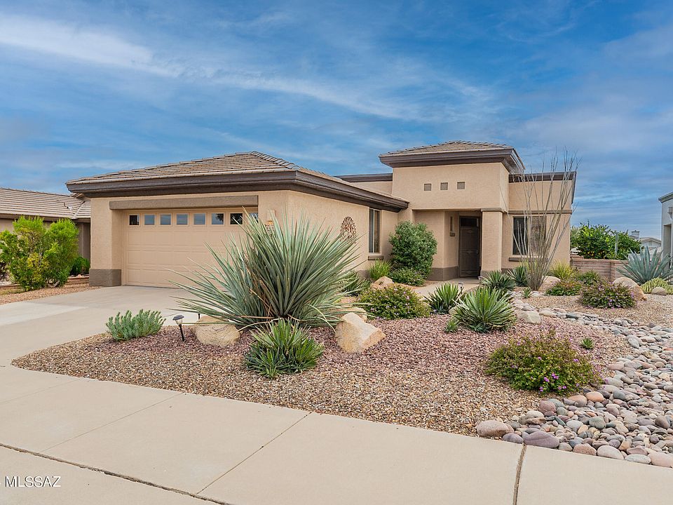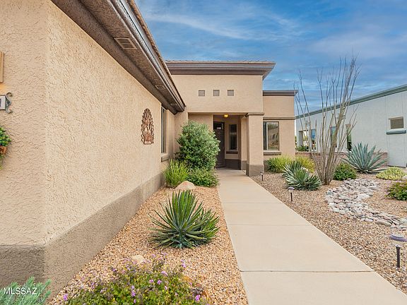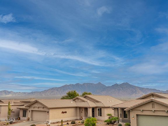 This home is elevated showcasing the beautiful Santa Rita Mountain range. It has an open floor plan which brings the living room, dining room and kitchen all within view. Perfect for entertaining. The large windows bring in the perfect amount of light and show off the designer paint, professional window treatments and rich flooring. Kitchen is large with breakfast bar and quartz countertops. Primary bedroom is spacious with adjoining bathroom. Primary bathroom is a very functional room with dual sinks, walk in closet, shower and water closet. Guests will love their bedroom with a bathroom a short distance away. The exterior of the home has a babbling waterfall and professional landscaping. This home has everything one would need for life's perfect retirement.