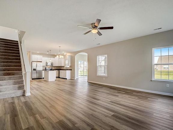 Renovated 5 bedroom 3 bath 3 car garage home in New Palestine complete with park, ponds and a pavilion. New flooring and paint throughout plus all three bathrooms have been updated. Beautiful open concept between the kitchen, dining room, and great room plus a sunroom. Kitchen features modern white cabinets, walk in pantry, granite countertops and stainless steel appliances. Upstairs has large bedrooms and two full baths. Large master bedroom with dual walk in closets, oversized bath w dual sinks, large garden tub and separate shower.