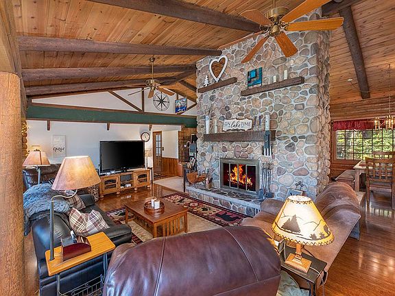 Wow! This kiln dried log home with 356’ of frontage on 60-acre Lake of the Hills is a must see! With over 3,600sf, 3BR/2.5BA, a fully finished lower level w/2 bonus rooms AND an ADORABLE guest cottage, there is room for EVERYONE! The living area views are spectacular, whether looking at the lake or the STUNNING field stone fireplace. This is rustic Northwoods heaven & includes an 1835 Majestic cast iron stove. Start & end the day on the open deck. The primary BR boasts gorgeous views & a huge bath with whirlpool tub & walk in shower. The newly renovated guest cottage, part of the detached garage, is ADORABLE w/living space upstairs, bed & bath downstairs. With a few exceptions, everything is included making this a turnkey property! Snuggled onto 4.3 acres of wooded wonderland, you’ll love the privacy & the views! Snowmobile trails can be picked up just down the road & the conveniences of Eagle River are minutes away. Keep it for yourself, rent it out or maybe a little of both!