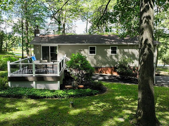 Private setting on over half an acre with an oversized detached garage and attached garage! Enjoy the wonderful views on the expansive maintenance-free deck! Inside, enjoy the ease of one-floor living with a bright living room, dining area, kitchen, three bedrooms, and a full bath all on the main level. The spacious kitchen offers a breakfast bar and is open to the dining and living areas - making entertaining a breeze. The finished lower level adds even more living space, including a family room with a cozy wood-burning fireplace and a convenient powder room and laundry room. A versatile flex space leads directly to the garage, offering endless possibilities—perfect for a workshop, hobby room, or even additional living space. Great location - convenient to local amenities, restaurants, and shopping.