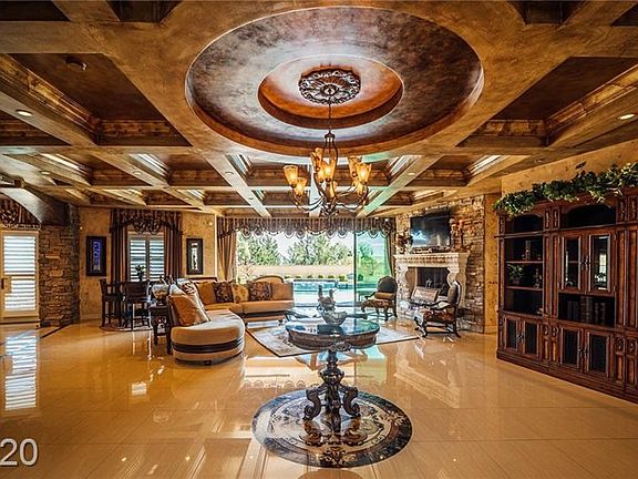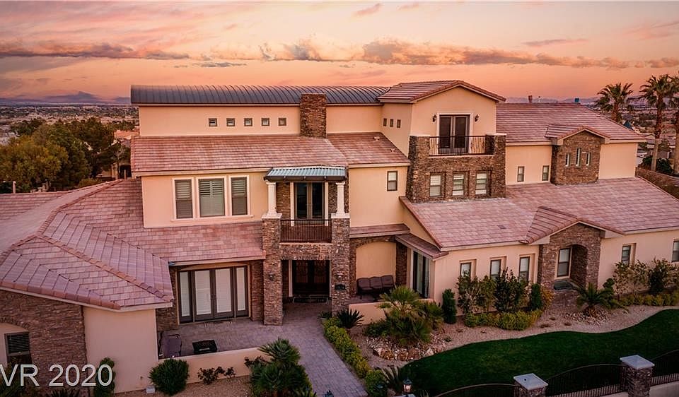 Enjoy this beautiful home with over 12,000 sq. ft. of Tuscan style perfection. This custom home has 7 En suite bedrooms & 11 total baths; dual masters on both lower & upper floors. The upstairs master bedroom offers a sitting room and a balcony overlooking the strip. The living room & downstairs master bedroom opens onto the resort style pool that includes fountains, water falls, firepits & an acrylic hot tub. Enormous Gourmet Kitchen perfect for entertaining with designer appliances, custom cabinets, dual islands that would inspire any chef. Built in Bosch Coffee/espresso maker, Coffered ceilings finished in Venetian Plaster & Faux finishing's. Enjoy the breathtaking views from multiple oversized balconies throughout offering 360 degree views of the strip, mountains & city. This entertainers paradise offers a dedicated 18-person home theatre along with an exquisite 3000 sq. ft. sports bar complete with billiard table, wet bar, and 360 degree views of the strip, mountains & city.